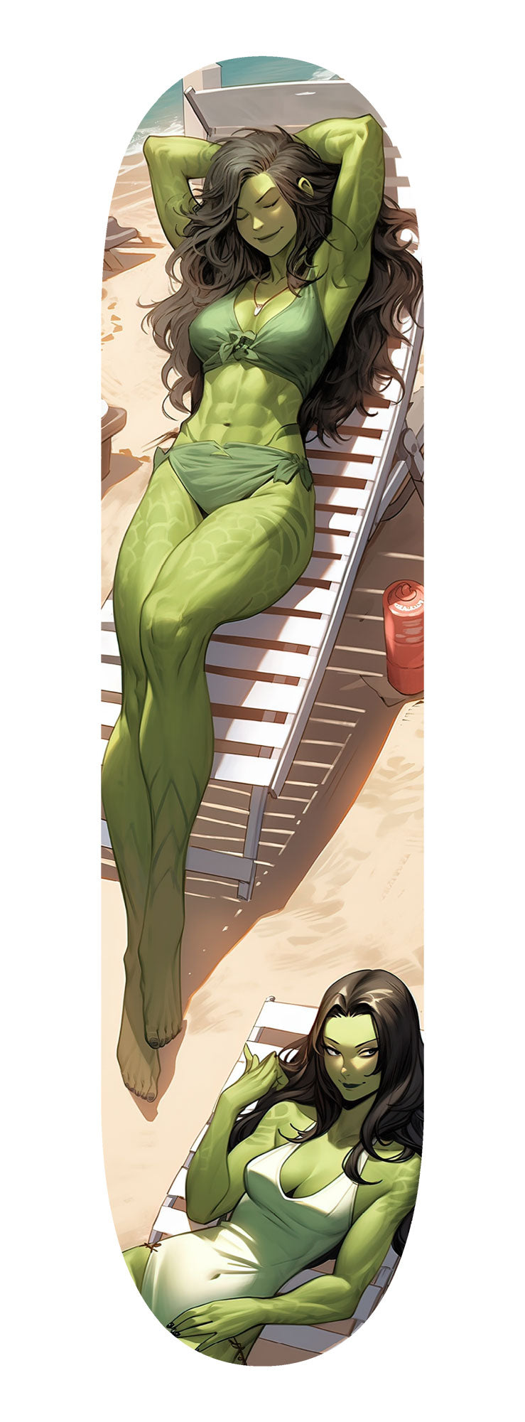 The vixens, their emerald skin shimmering in the sunlight, exude an air of sultry confidence as they lounge gracefully in their chairs. Their long, flowing hair, a lush verdant hue, cascades down their shoulders in waves, catching the light and adding to their fanciful beauty.