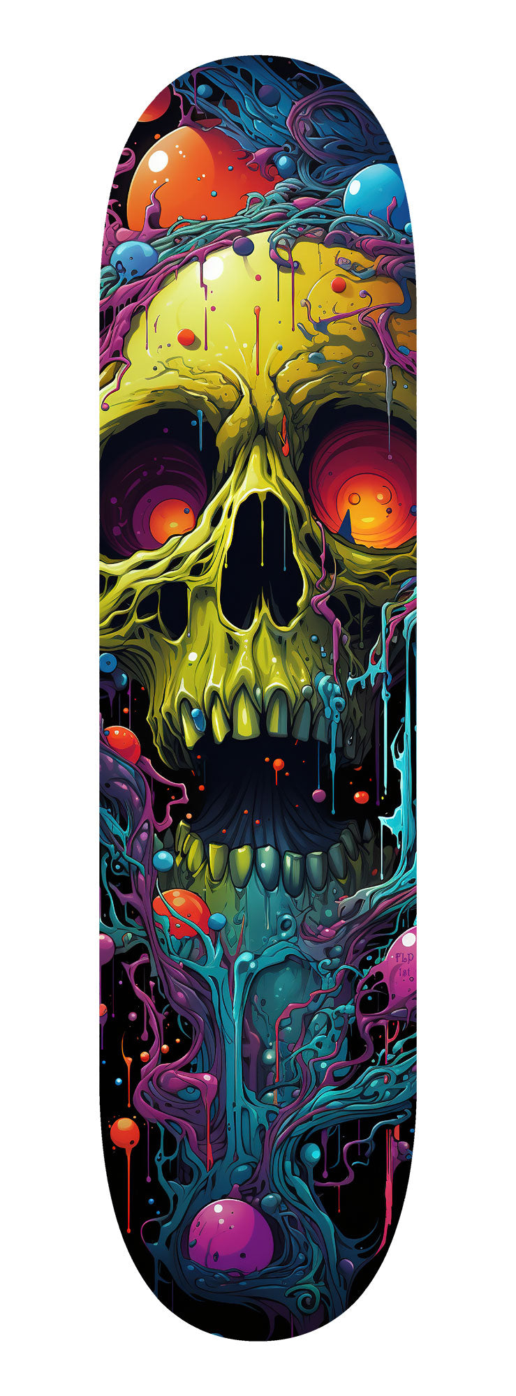 In a mesmerizing display of cosmic artistry, a psychedelic skull emerges from the depths of the cosmos, bathed in vibrant hues that dance and swirl with kaleidoscopic intensity. Against a backdrop of swirling galaxies and twinkling stars, this skull commands attention with its surreal presence.